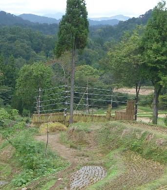 [1449] ⇒ 原画 2010/10/22 dai 新田ハサの変遷 - 2004年 新田の主、こうじろうおじいさんが主体で、棚田ネットワークが手伝いに来てやった最後の年です。 新田の上、道路沿いに長い頑丈そうなハサを立てていました。 |
