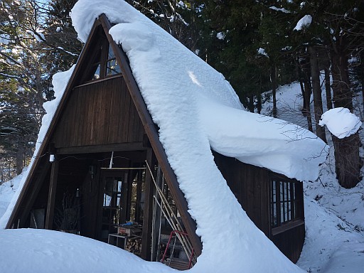 松ノ木小屋に到着。大雪で屋根に雪が巻きつくようにまといついてる
